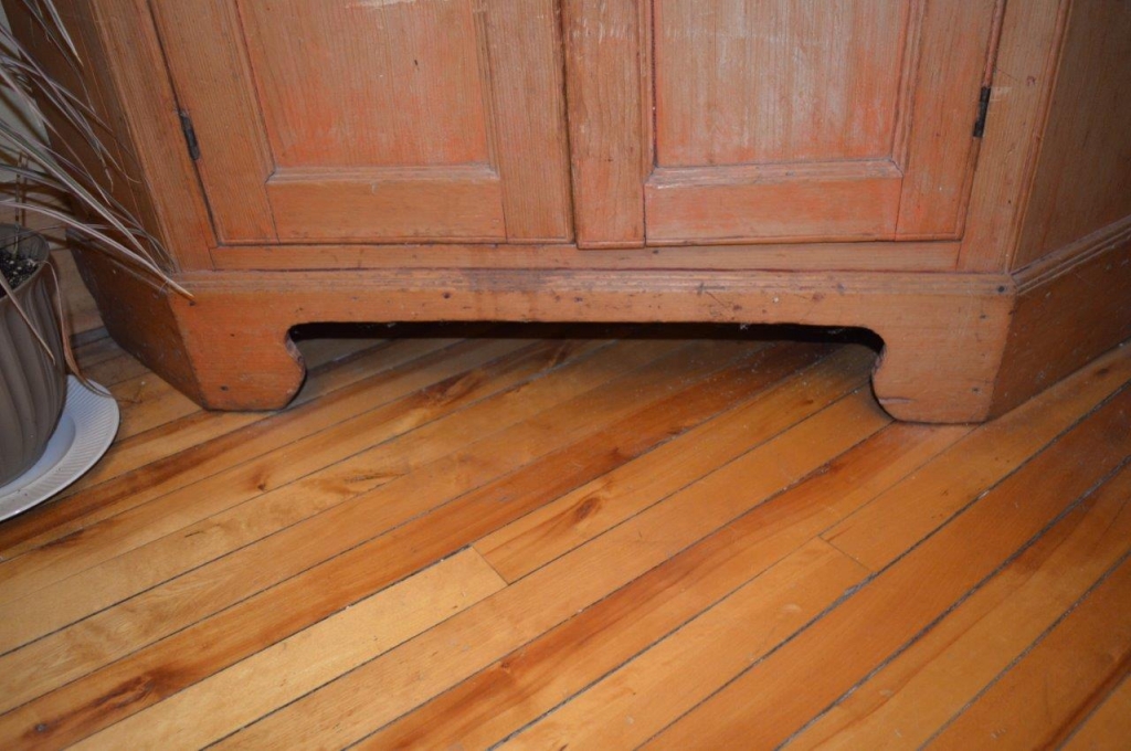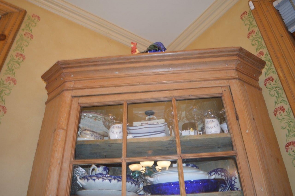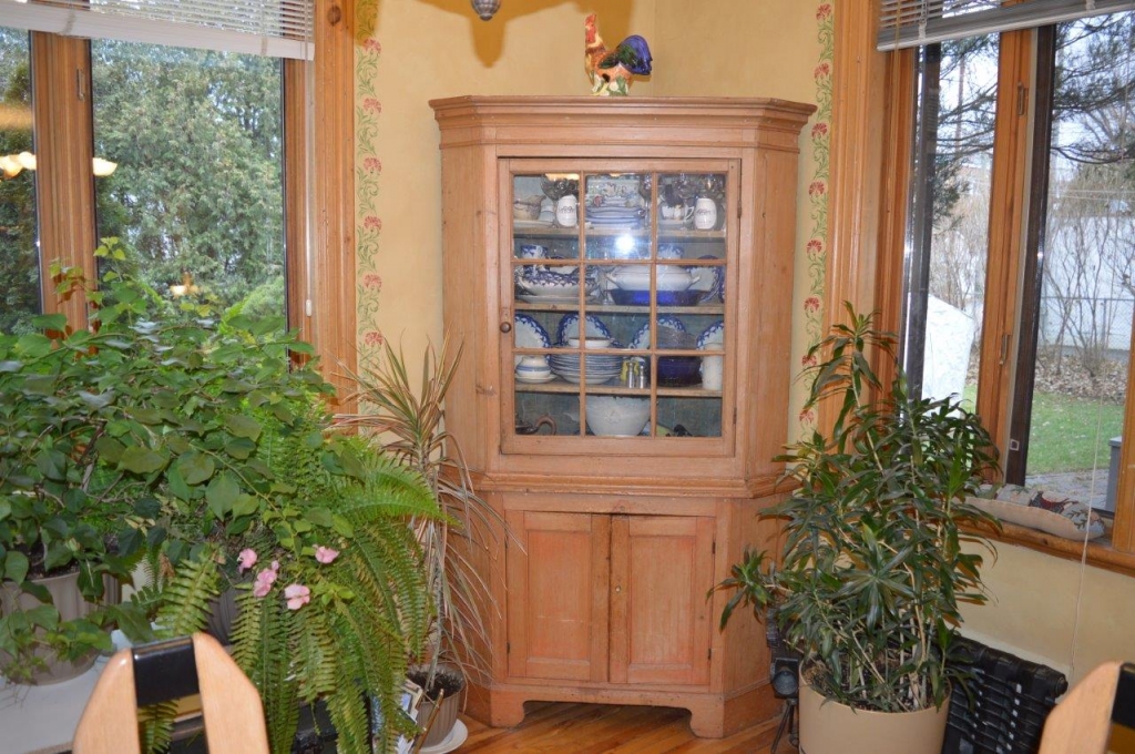 Nice very old 2 piece corner cupboard. Forged nails and 9 glasses in top dootr. Really beautifull and fresh out of a Montreal collection. 79 inches high, 45 wide.
