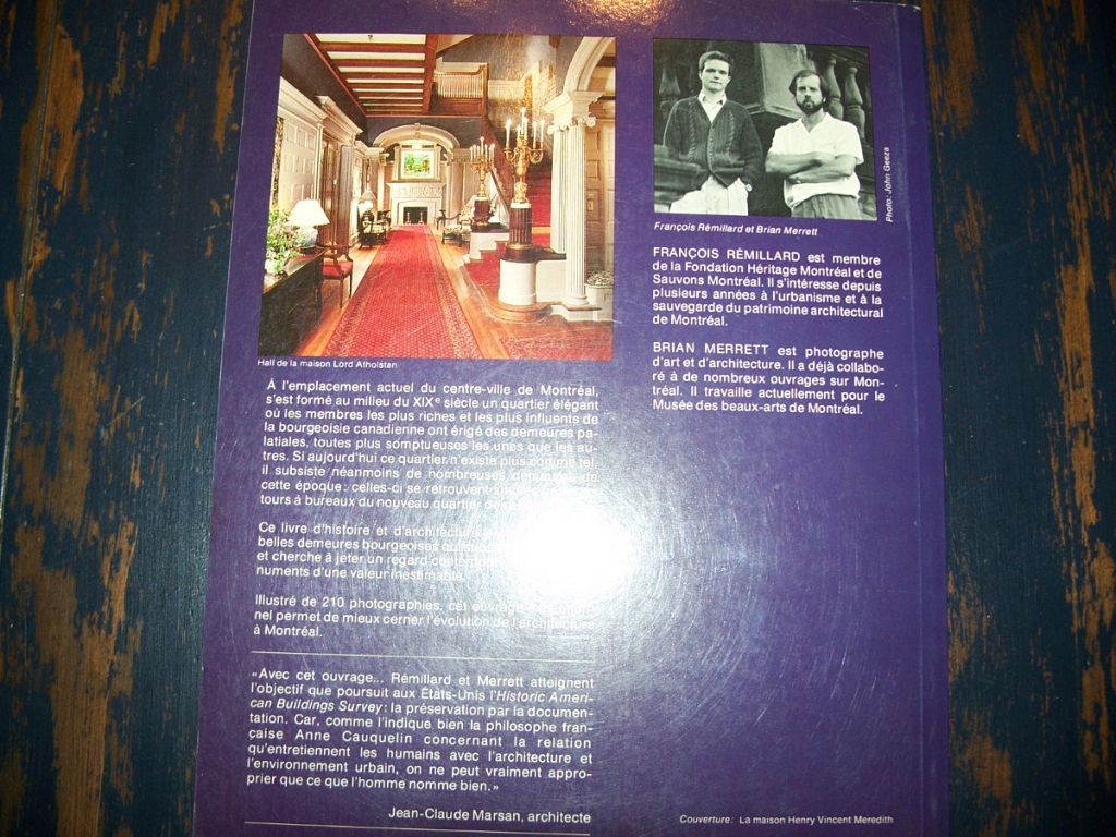Beau volume de 1987 sur les superbes demeures bourgeoises de Montréal. 240 pages remplies de photographies noir et blanc ainsi qu'énormément de documentation sur ces bijoux de Montréal.