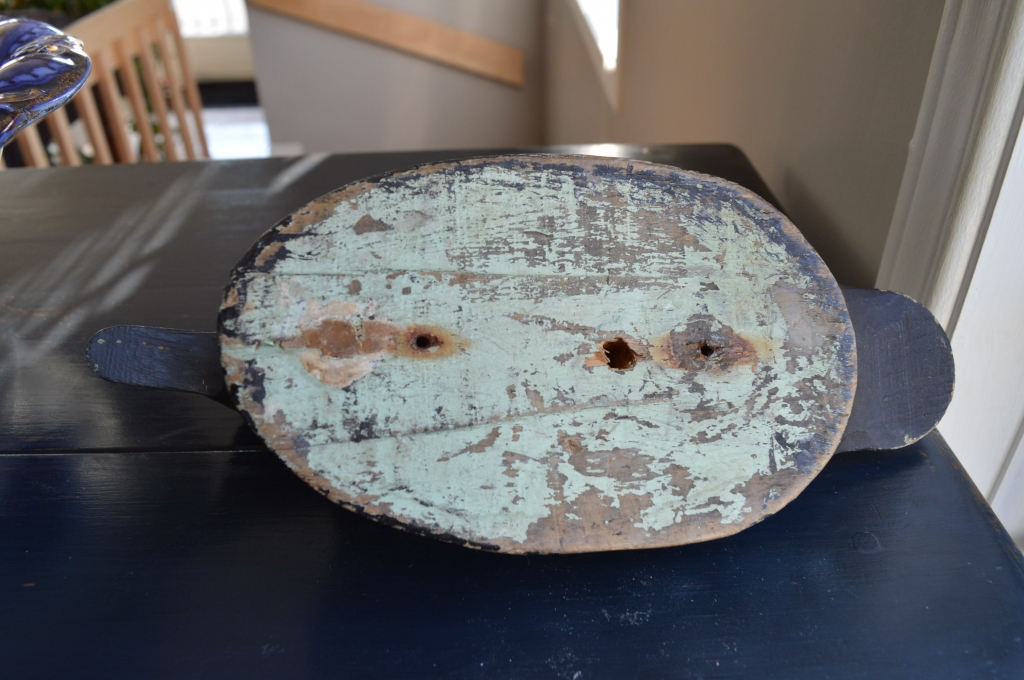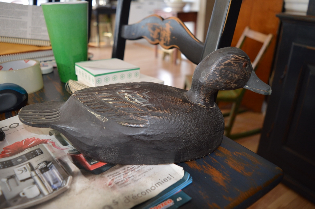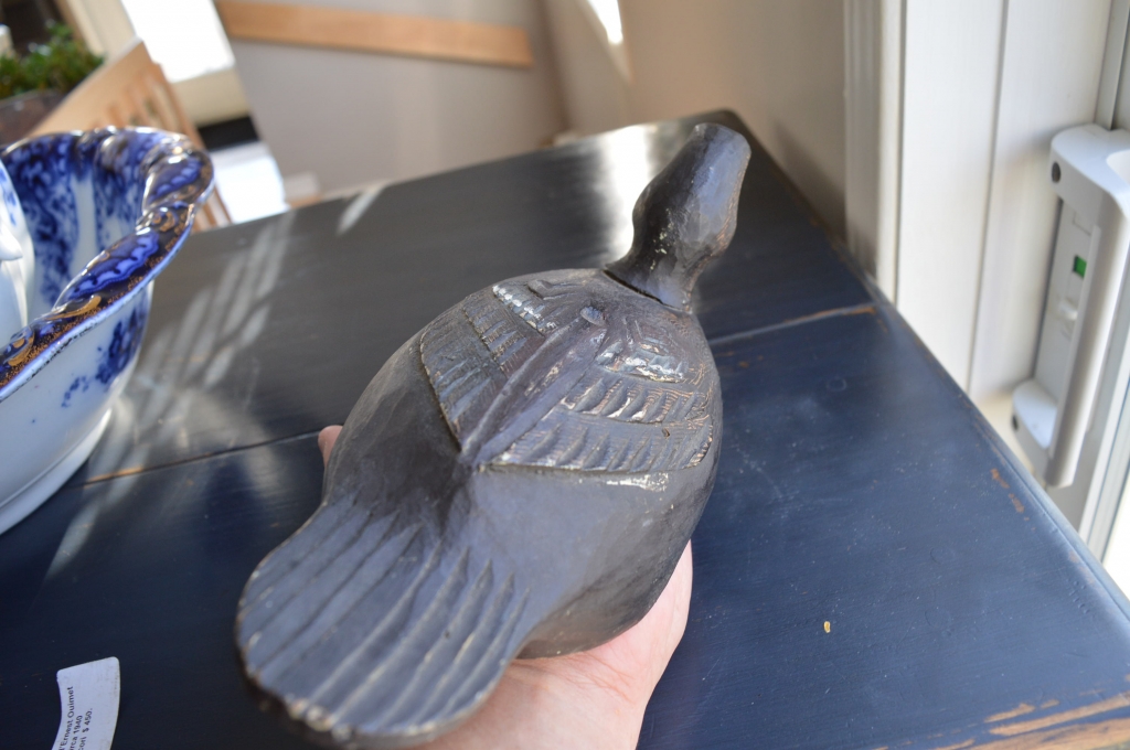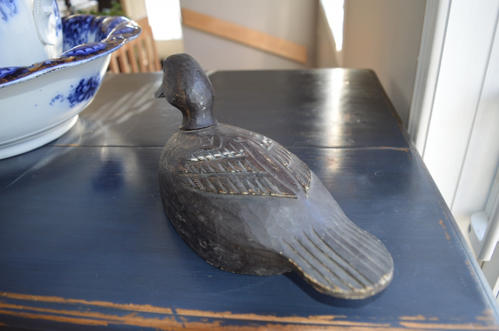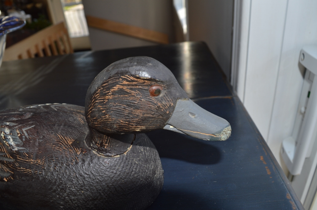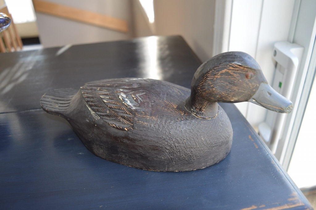 Nice small teal from Ernest Ouimet. Circa 1950, it is in great dry condition the only flaw is a small part undr the beak was partially broken and not very well glued back so it would need a little work but really nothing. Nicely carved, 12 inches long from beak to tail.