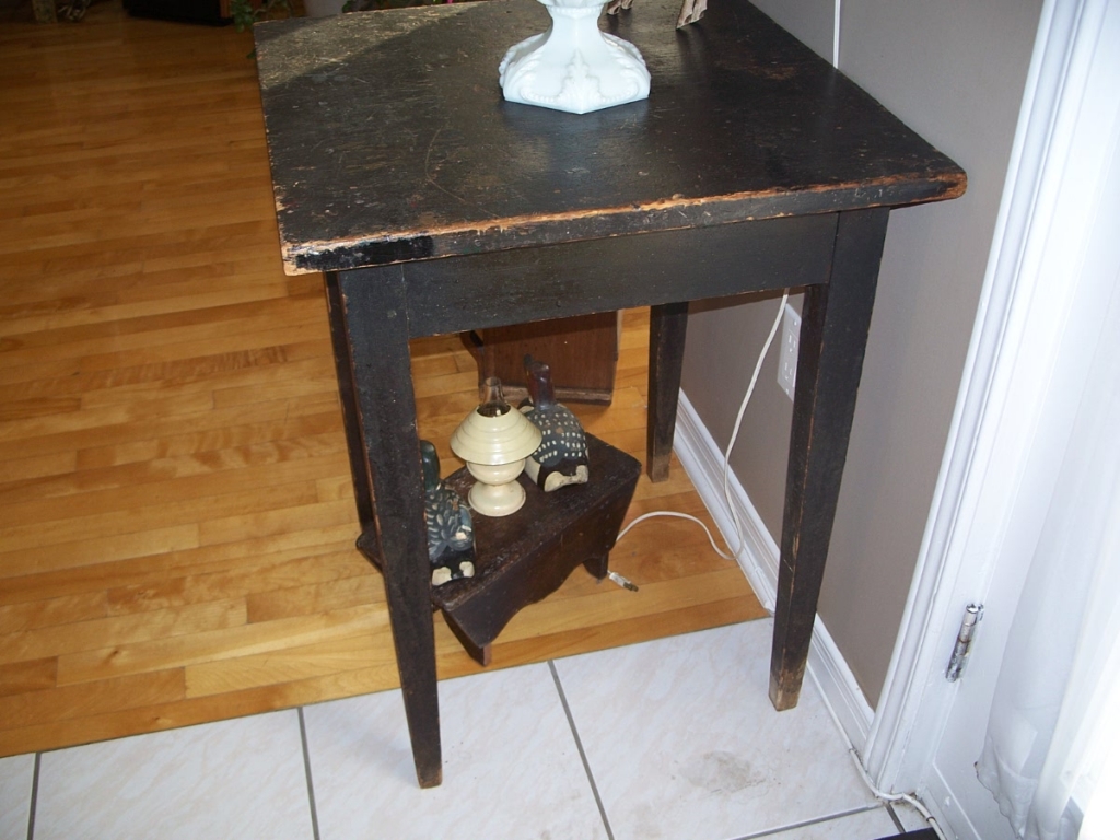 Beautifull circa 1850's side table. Totally original with its black color and many more under but absolurely no use of touching this piece. The top is 23 inches square and one board, all woodpegged, it is 29 inches high. A real beaty with tapered legs ready for the house, coming from my own collection.