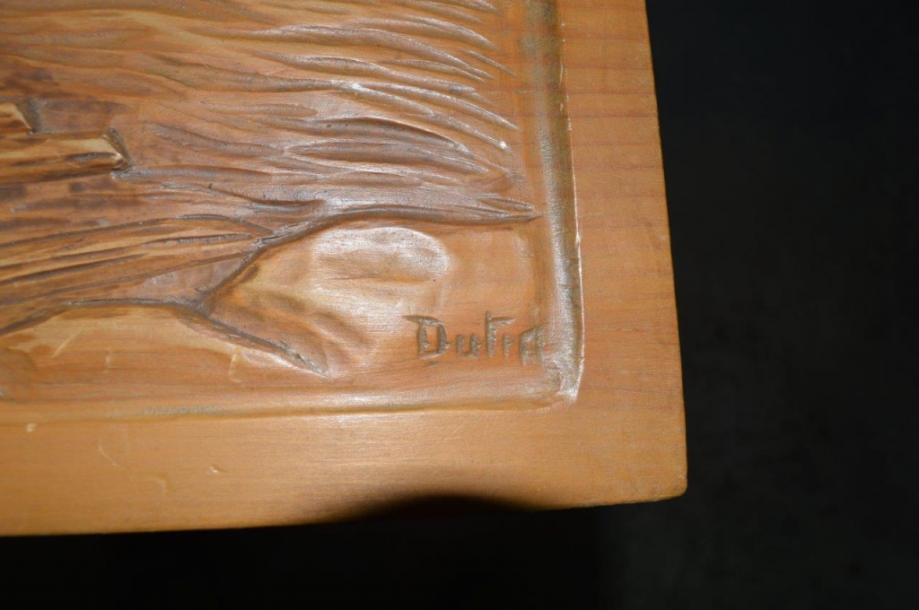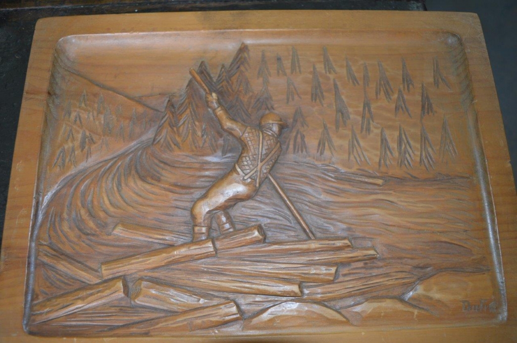Bas relief en pin, 16 X 11.5, très bonne condition et belle patine pièce signée mais je ne suis pas certain du nom. Scène de drave.Succession feu Michel Sauvé.