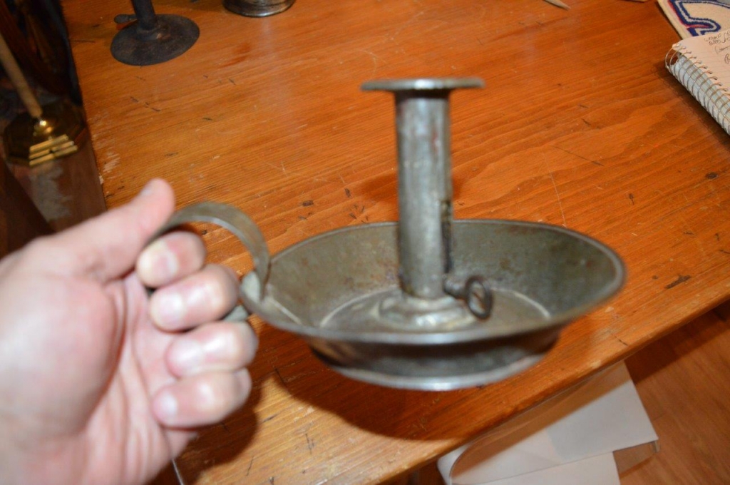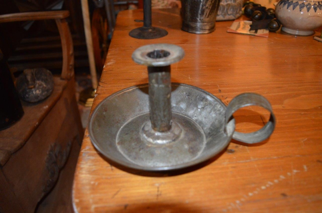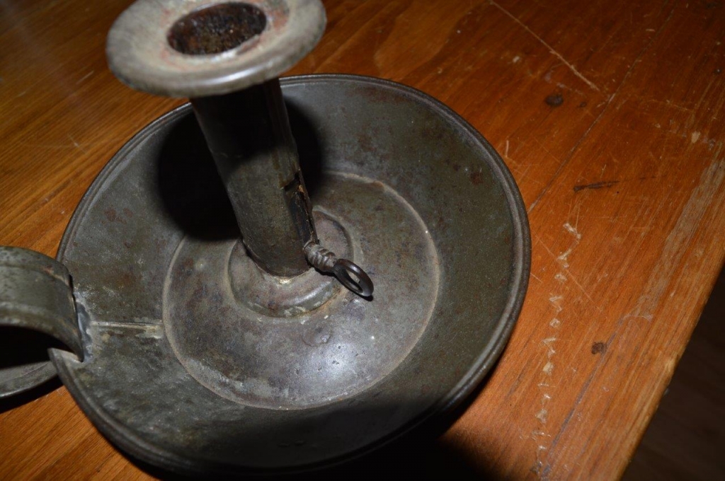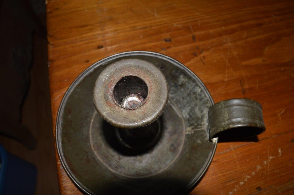 Très beau vieux bougeoir en tôle,excellente ècondition 8 pouce de l'anse au bout et 4.5 de hauteur. Succession Michel Sauvé.