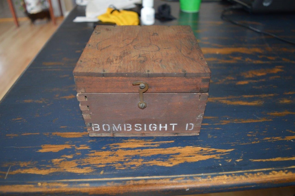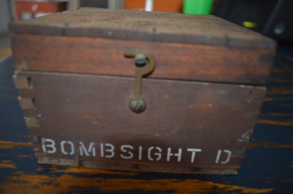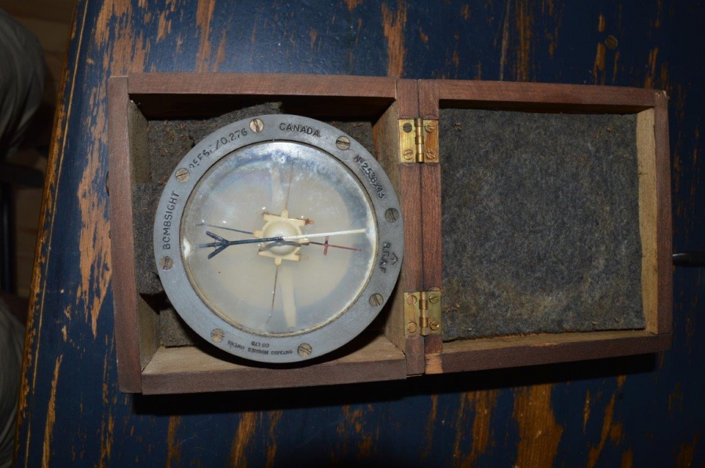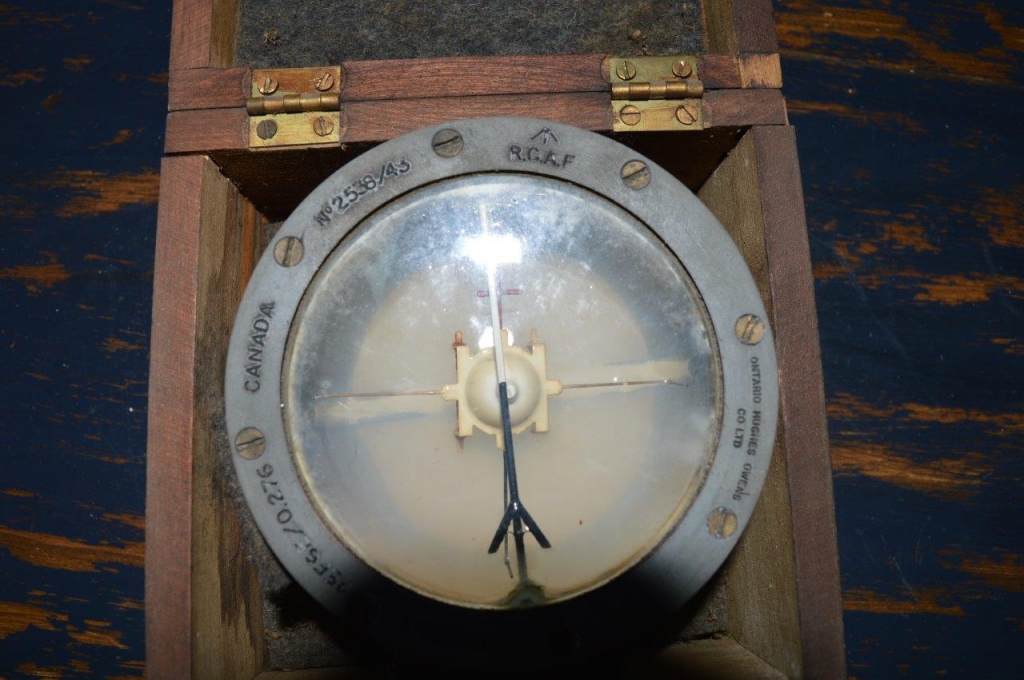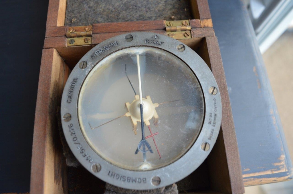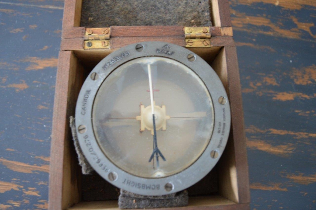 Boussole militaire de la deuxième guerre mondiale. Bombsight compass D, fabriquée au Canada en condition opérationelle avec le liquide à l'intérieur et dans sa boîte de protection en bois montée à queues d'arronde. Il y à des lettres et numéros de poinçonnés tout le tour, : BOMPSIGHT REF 6E / 0.276 CANADA # 2538 / 43 RCAF pour la Royal Canadian Air Force.