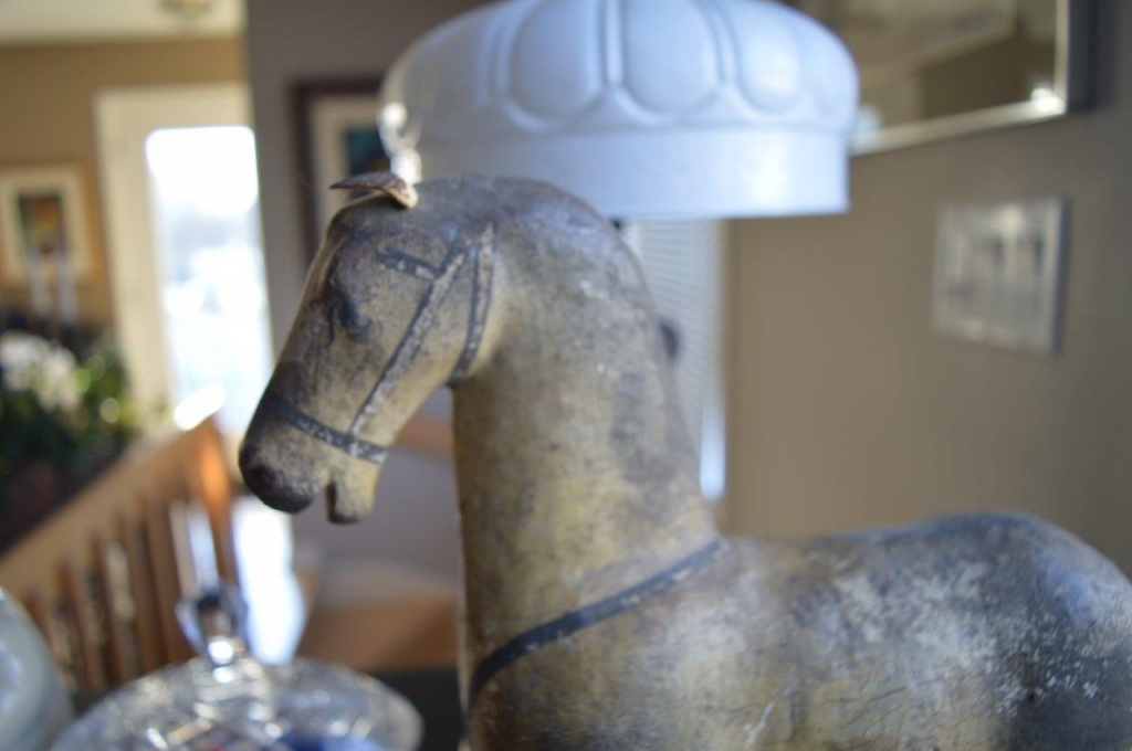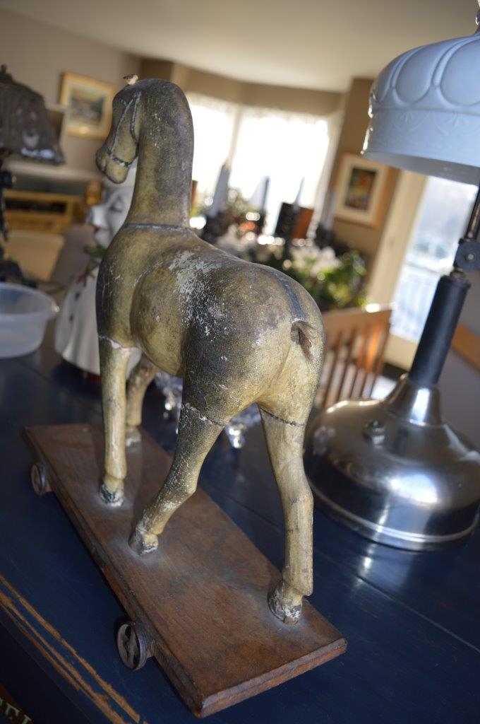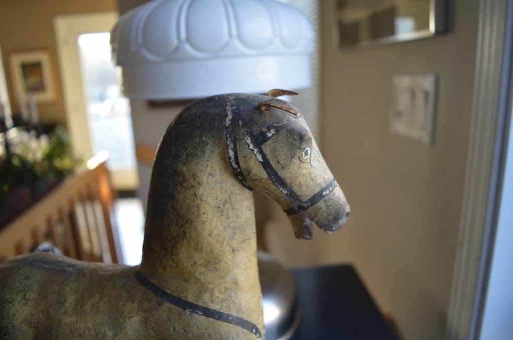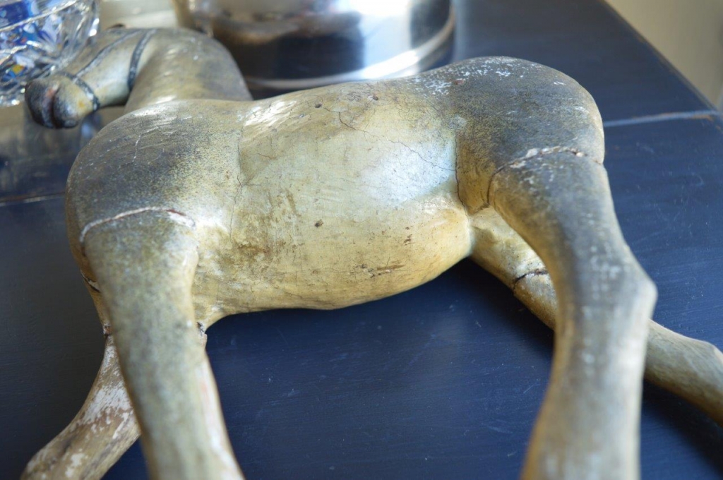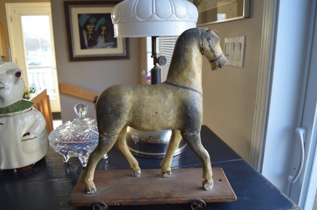 Une autre pièce digne d'un musée, provenant de la collection de feu Michel Sauvé Cheval de bois sculpté, piece de 14.5 pouces de hauteur et 10.5 de long pour le cheval et 13.5 hors tout avec la base. Couleur hallucinant et condition superbe. Pièce du 19e que vous ne trouverez pas souvent à qui la chance voilà un super cadeau de Noel pour l'être cher.