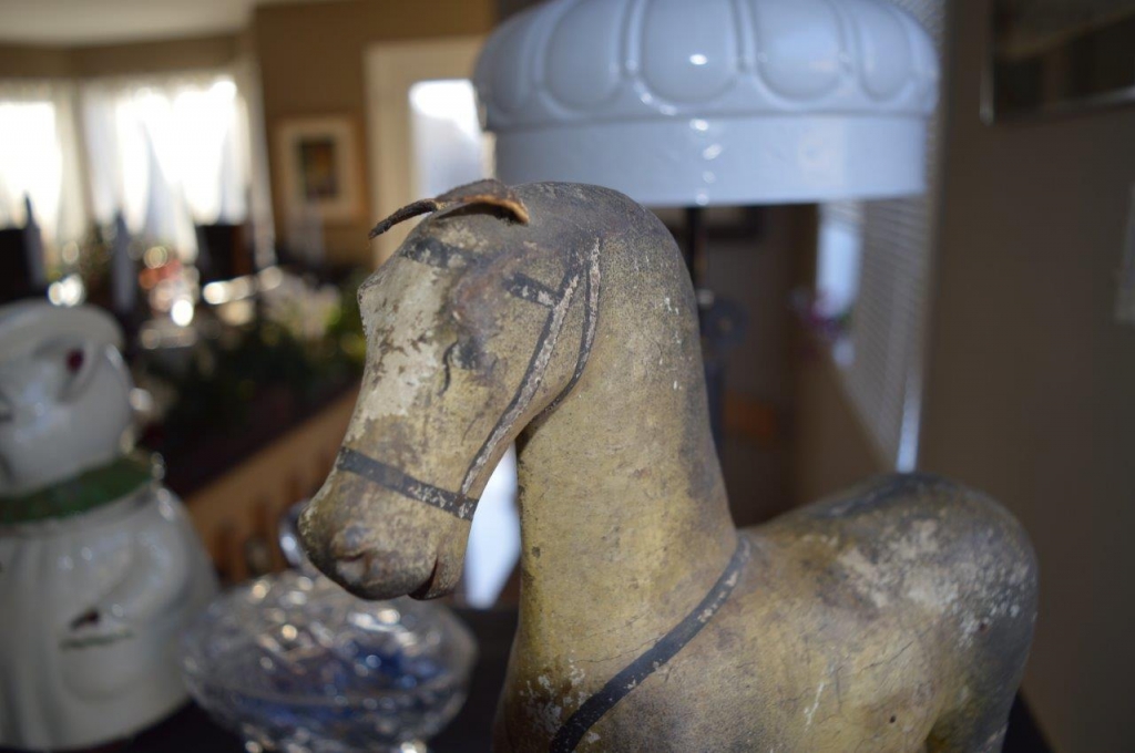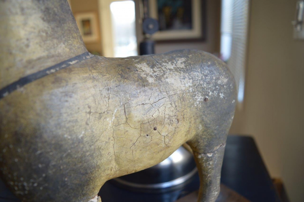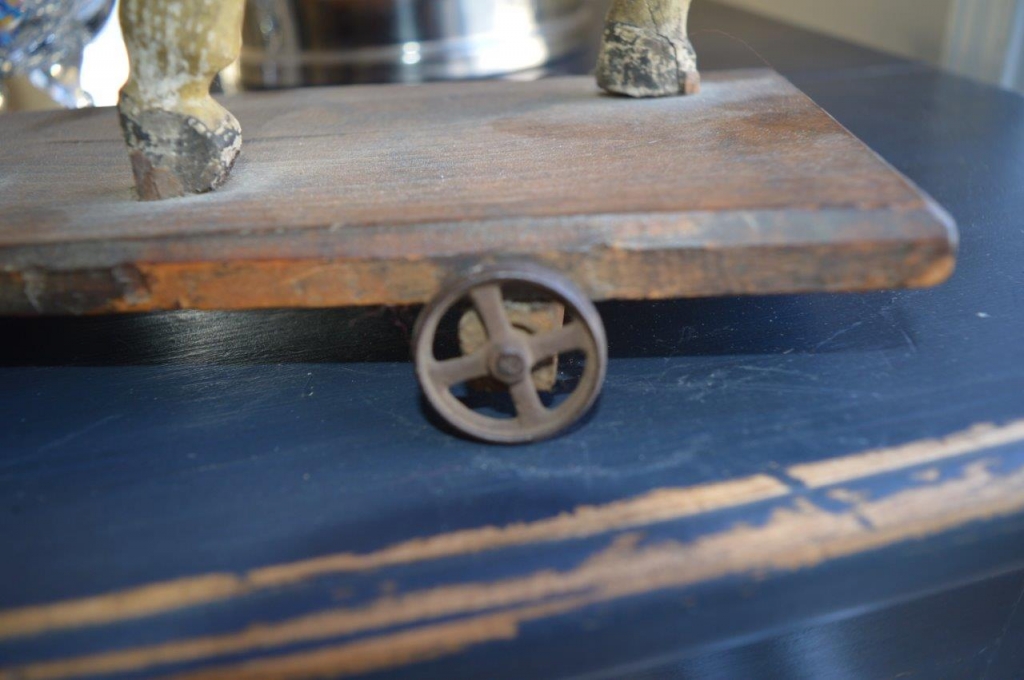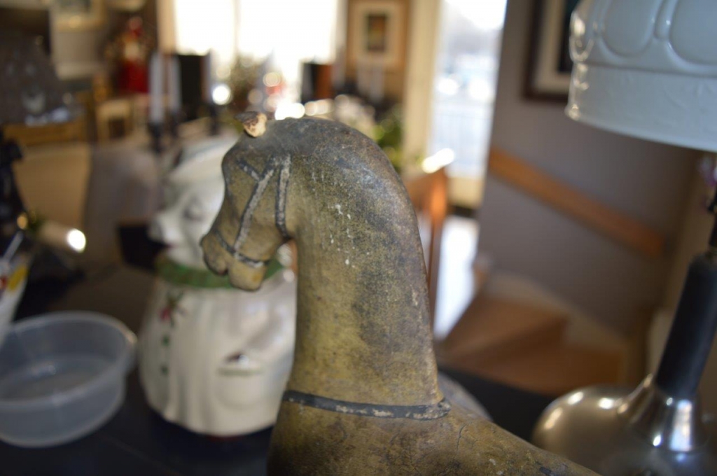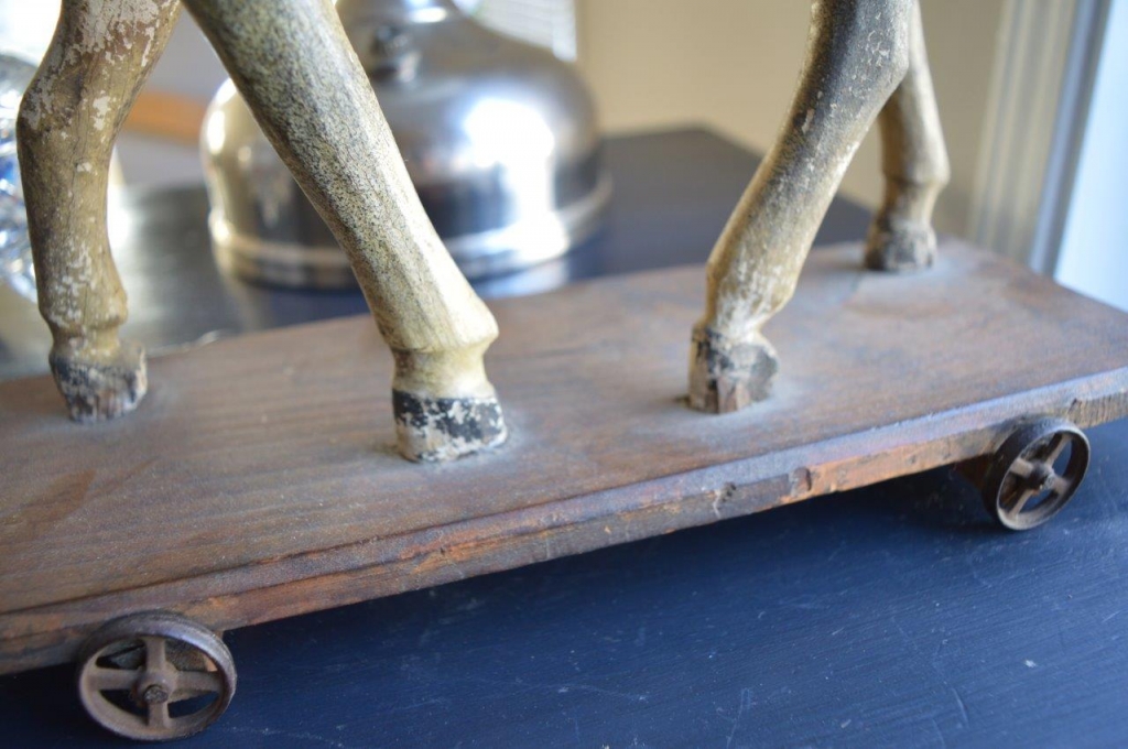 Une autre pièce digne d'un musée, provenant de la collection de feu Michel Sauvé Cheval de bois sculpté, piece de 14.5 pouces de hauteur et 10.5 de long pour le cheval et 13.5 hors tout avec la base. Couleur hallucinant et condition superbe. Pièce du 19e que vous ne trouverez pas souvent à qui la chance voilà un super cadeau de Noel pour l'être cher.