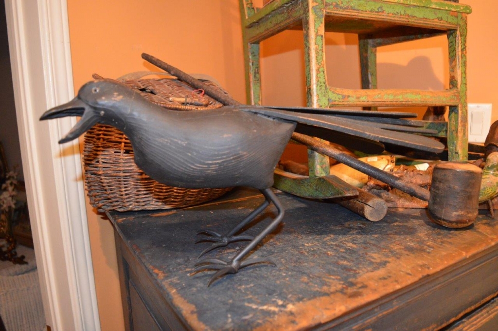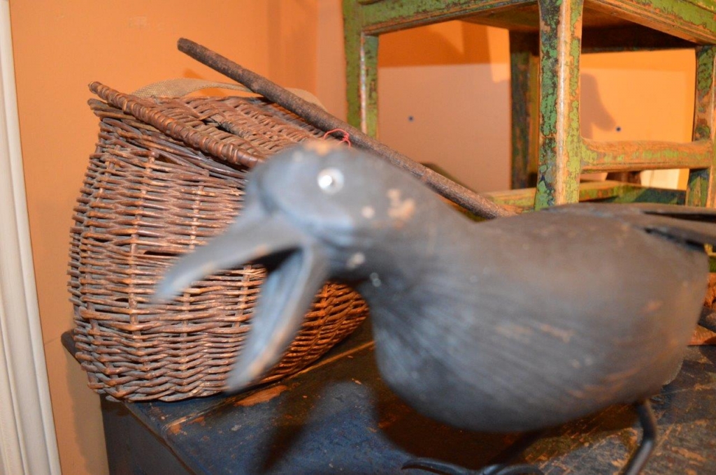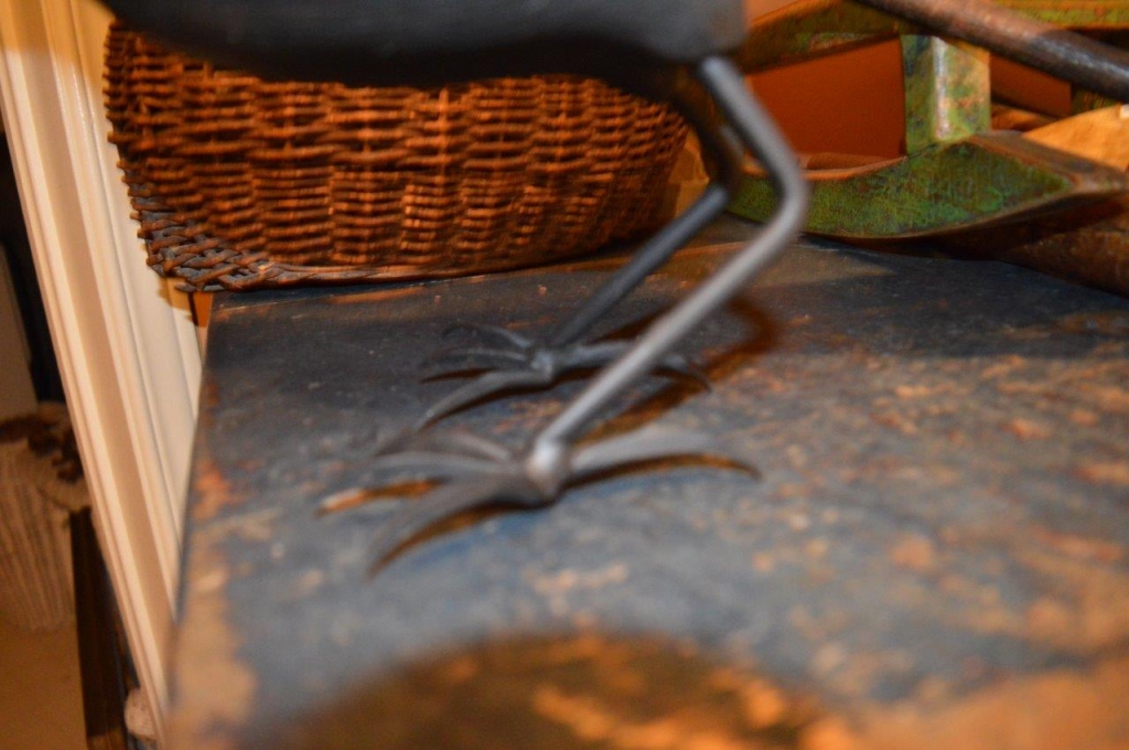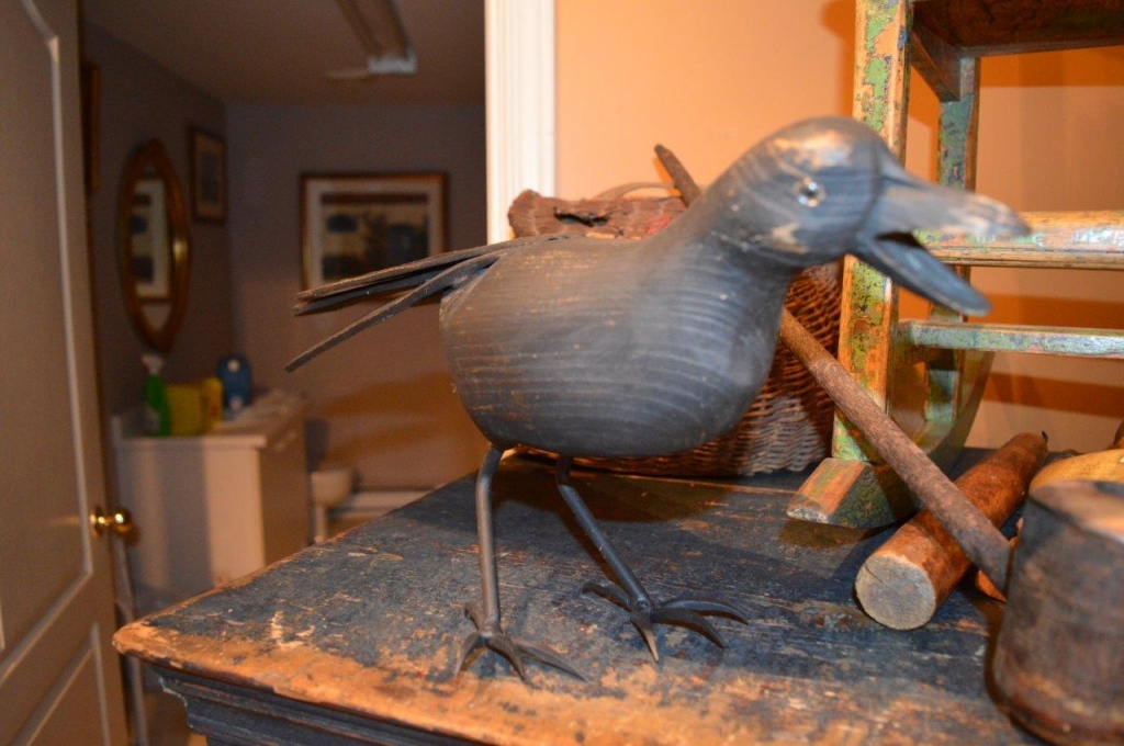 Belle corneille , pièce d'art populaire contemporaine sculptée en bois et avec des pattes en fer forgé. Belle grosse pièce d'art populaire fraîchement acquise à Sutton. 19 pouces de longueur.