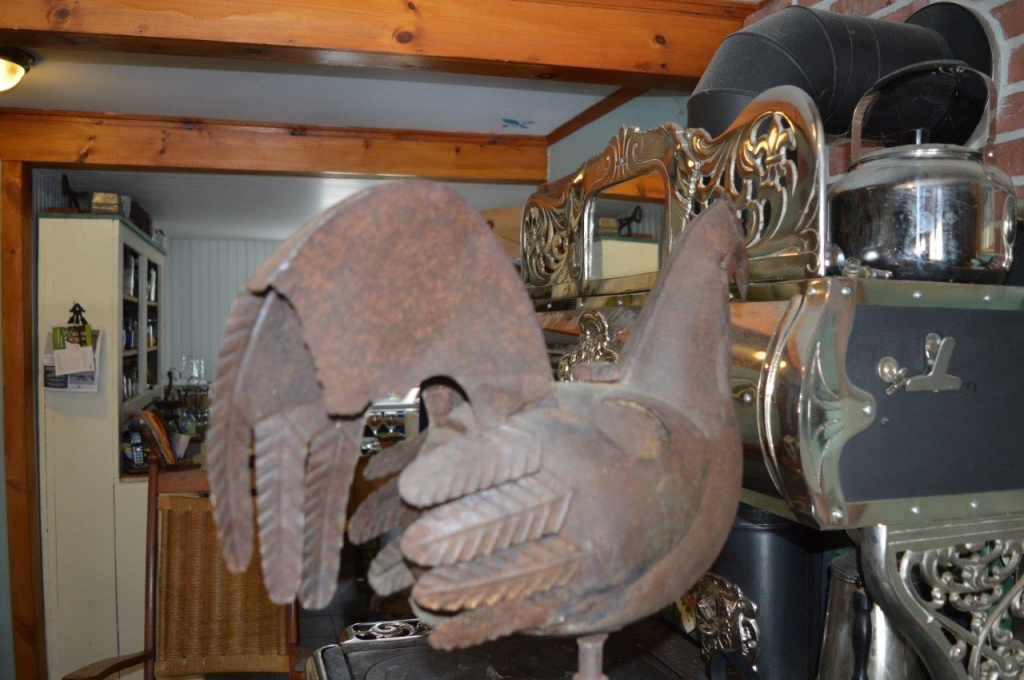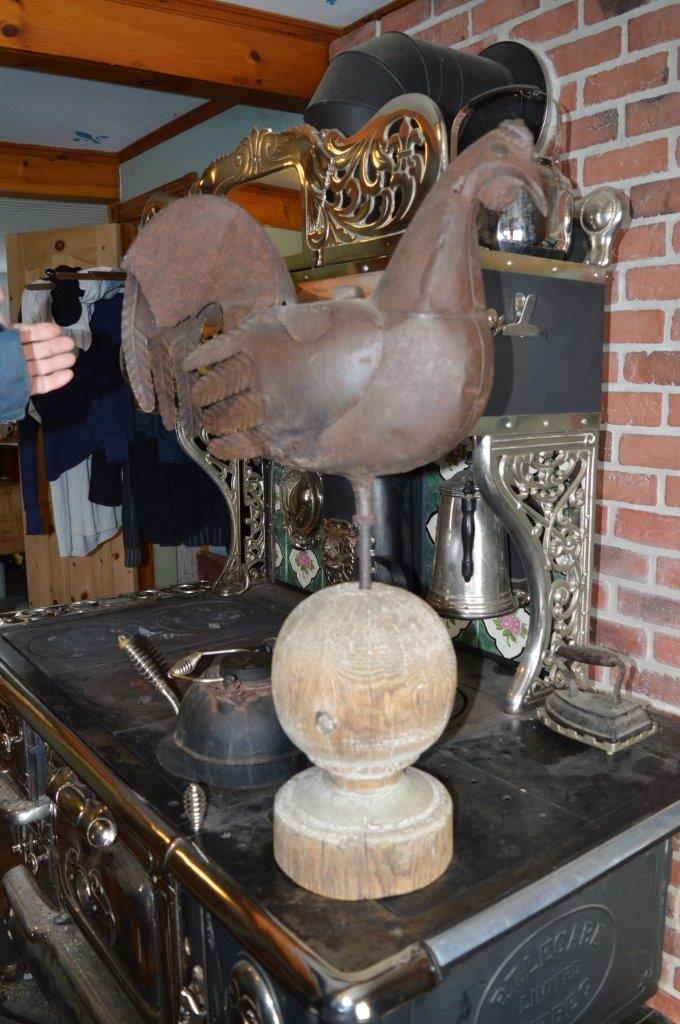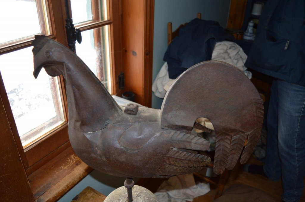 Belle vieille Girouette en forme de coq, pièce agée et ayant des traces marquées d'usure et quelque dommages structuraux. Thème extrêmement convoité même avec ses petits défauts. Provenant de la succession de feu Michel Sauvé.