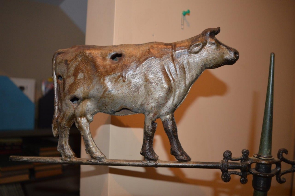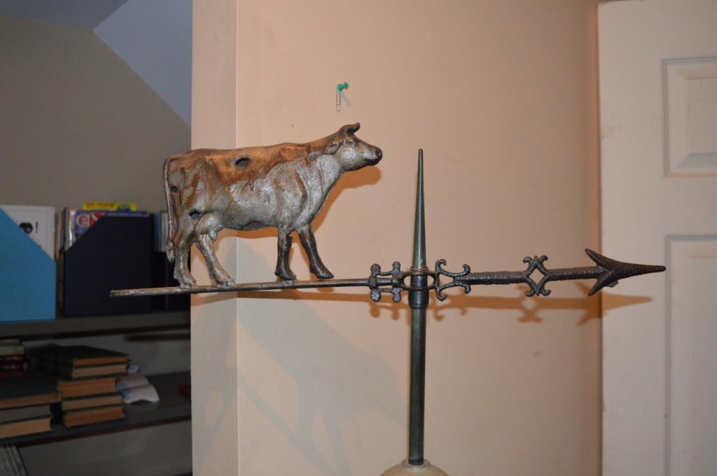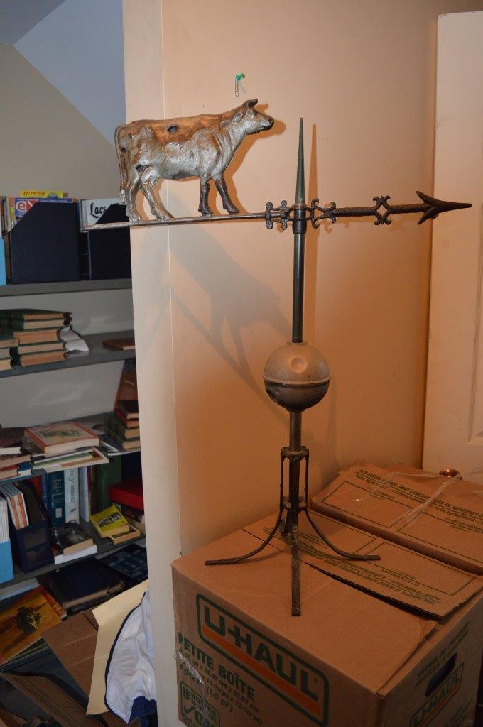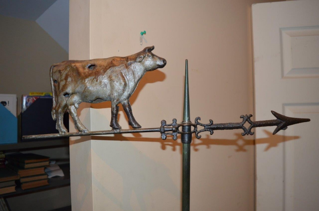 Belle girouette avec une vache , pièce montée sur une base de paratonnerre. 29 pouces de hauteur, trèes belle même si elle montre quelque impacts de plombs. Provenace succession feu Michel Sauvé