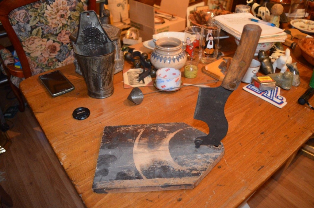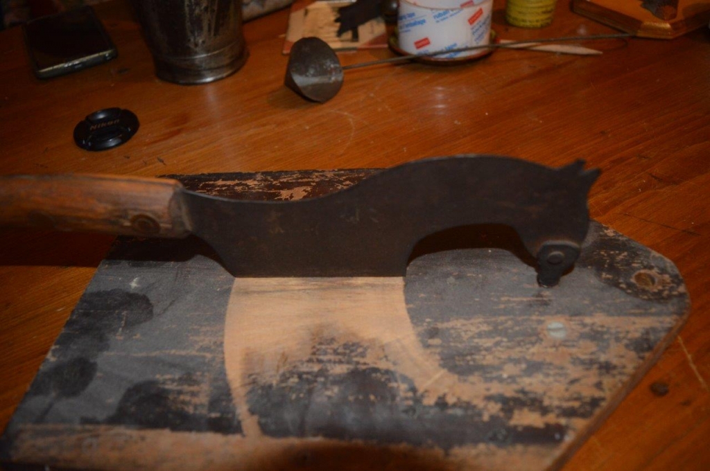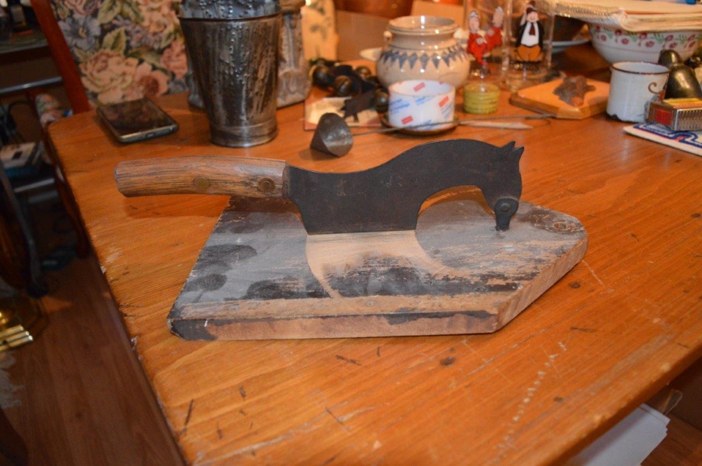 Hache tabac avec couteau en forme de cheval, 13 pouce pour la planche et de même pour le couteau découpé en silhouette de cheval. Belle pièece de la collection de feu Michel Sauvé.