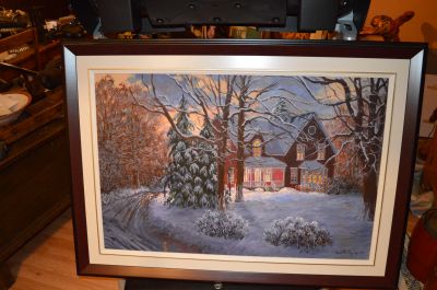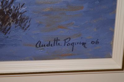 Grande huile sur toile de audette Paquin, superbe peinture d'une scène d'hiver, très lumineuse et de grand format, 24 X 36 plus l'encadrement 32 X 44. Très belle pièce de cette artiste que l'on retrouve dans plsusieurs galeries. Superbe peinture pour la moitié du prix d'une reproduction provenant d'une succession que nous venons d'acquérir.