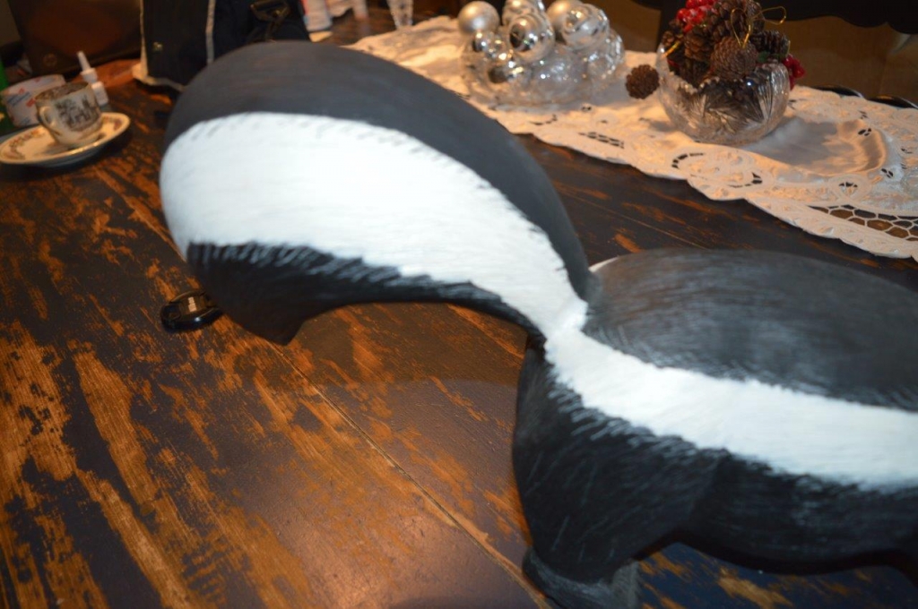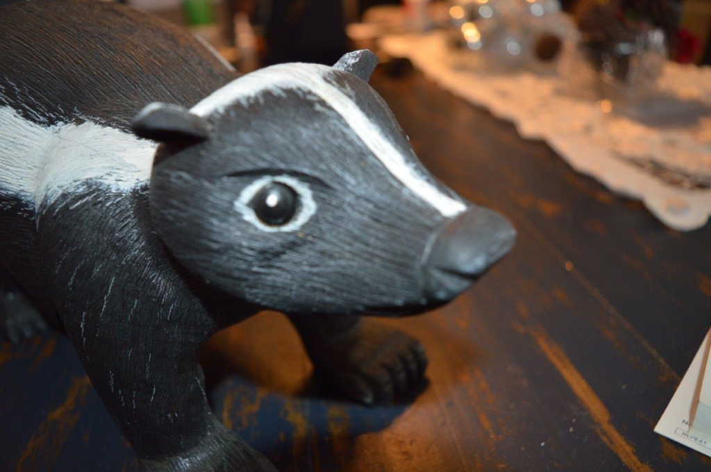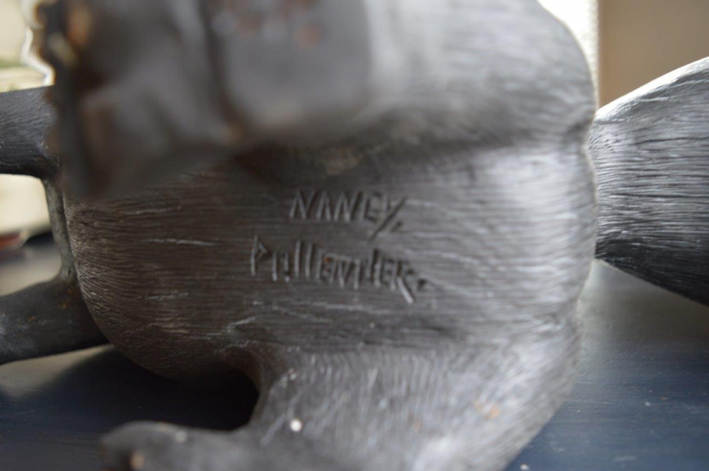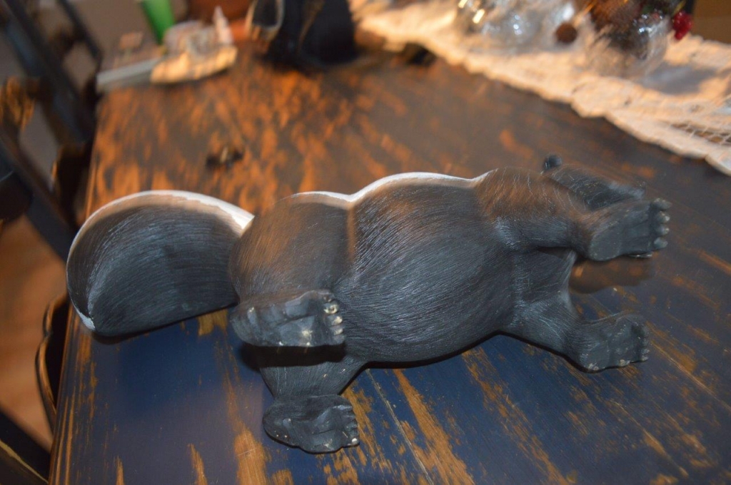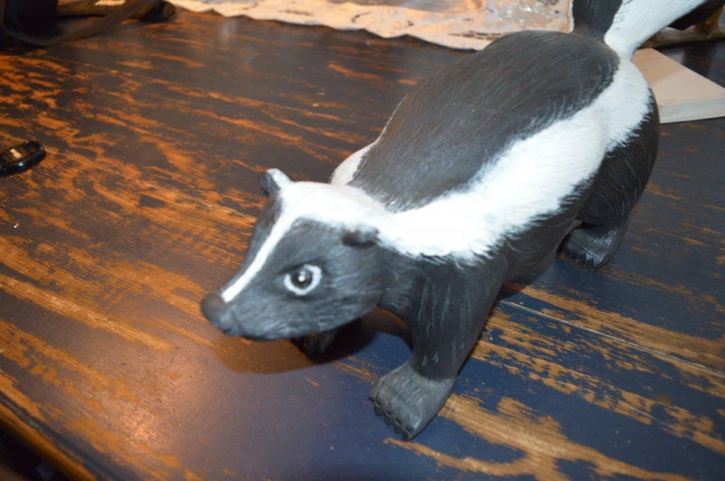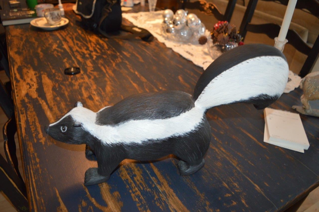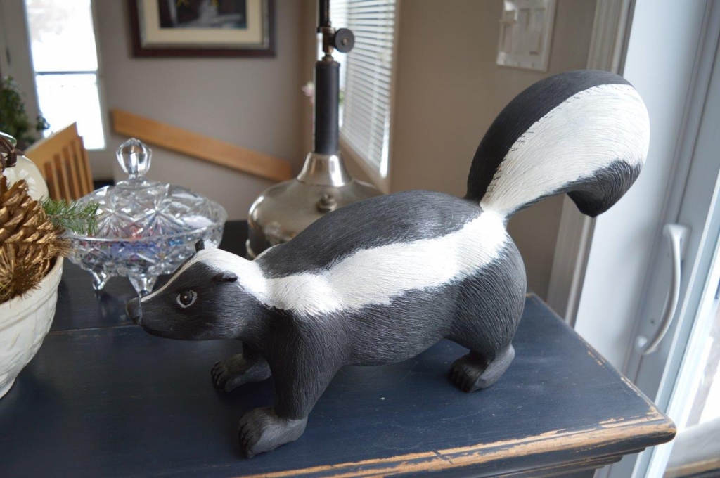 Belle mouffette sculptée par Nancy Pollander de Clarenceville QC. 18 pouces de long X 11 de haut au haut de la queue, la pièce est bien exécutée de même que le travail de peinture. Signée en dessous sur le ventre et initialée sous une patte.De la succession de feu Michel Sauvé.