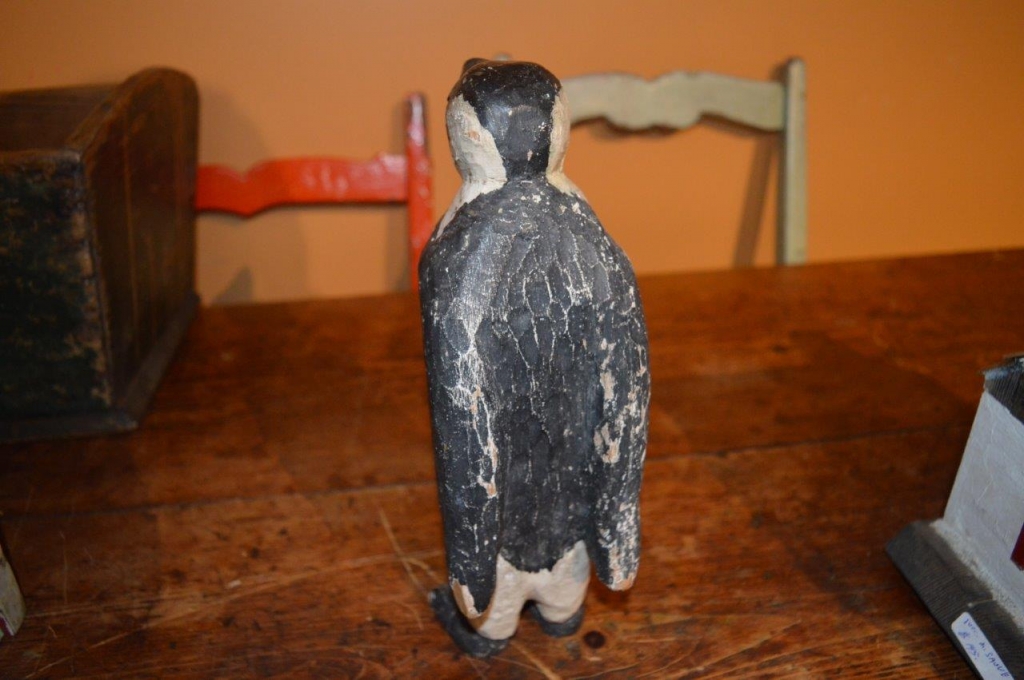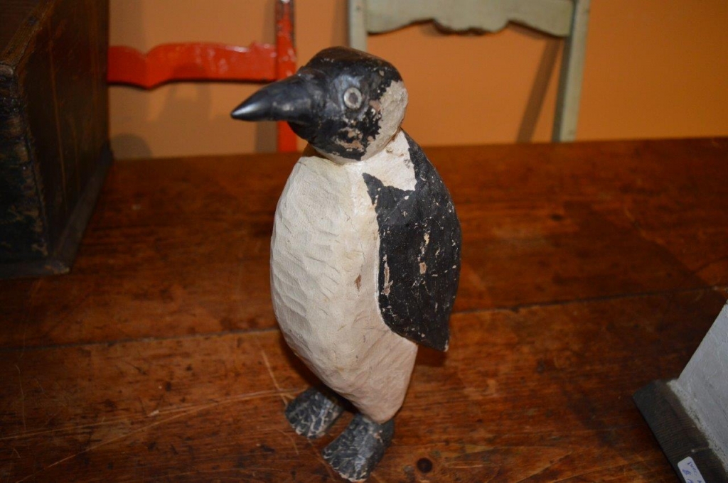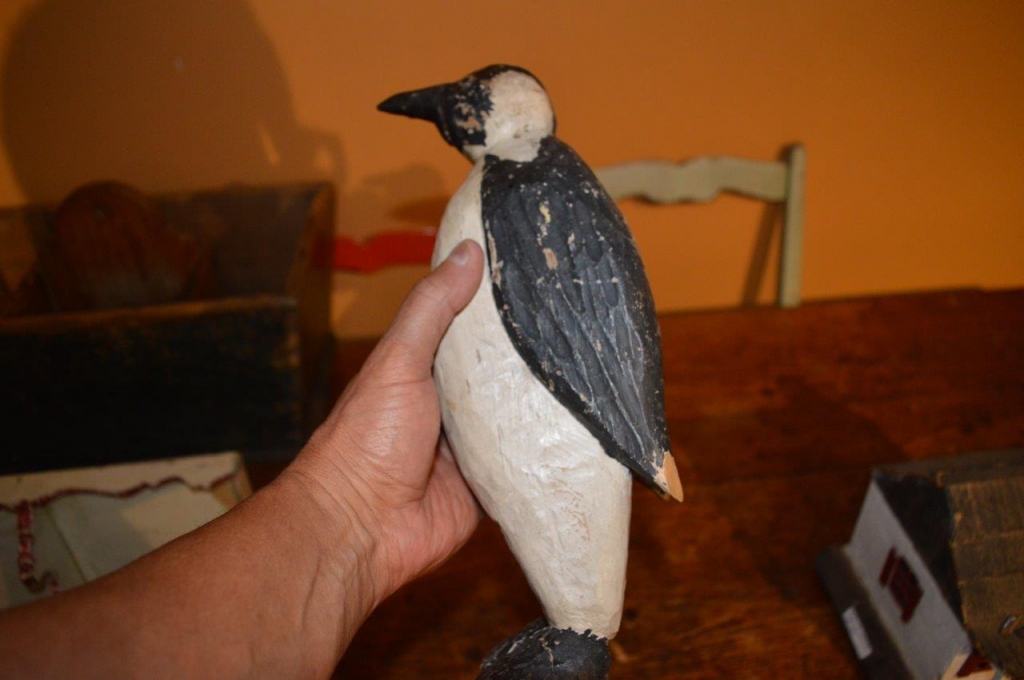 Belle petite pièce d'art populaire, belle couleur et proportins. 12.5 pouces de hauteur je n'ai pas de détails sur son age exact probablement années 50, ni de sa provenance car je l'ai acheté dans une vente de garage. Il fait partie de me collection depuis plusieurs années et il est temps qiu'il se trouve un autre chez-lui. Le bec à été recollé, on le voit sur une de mes photographies.