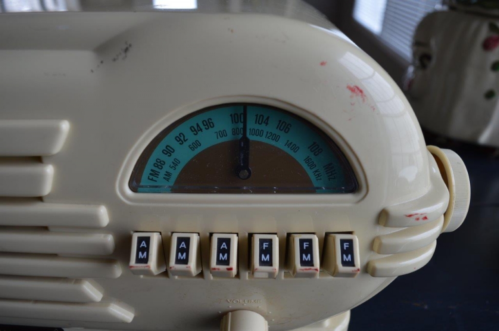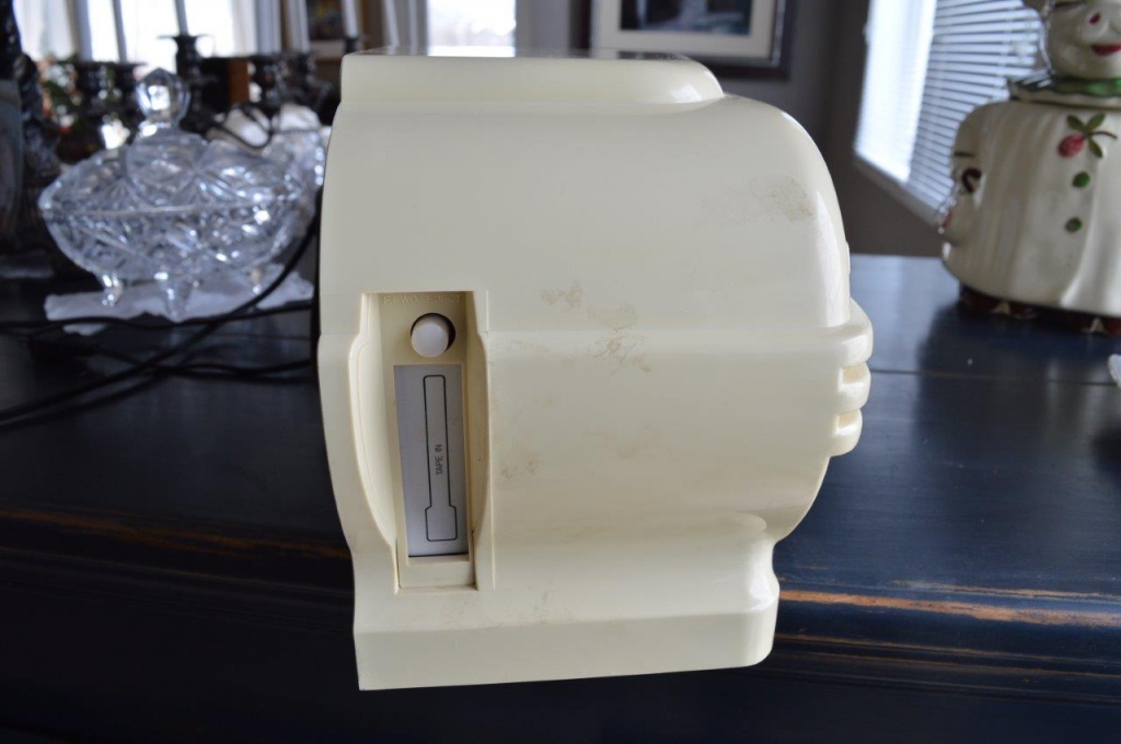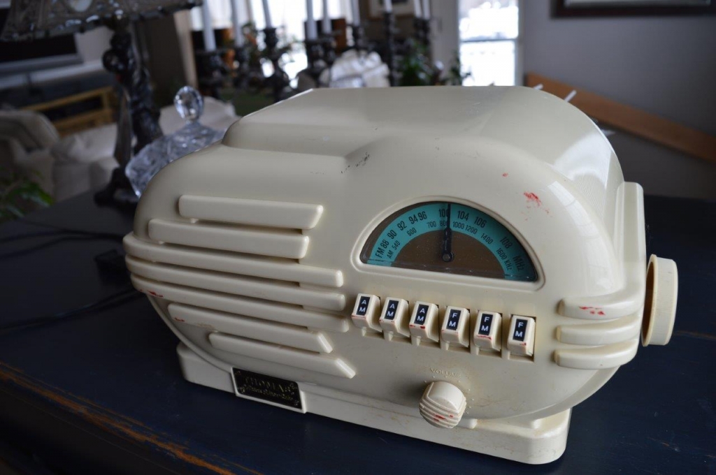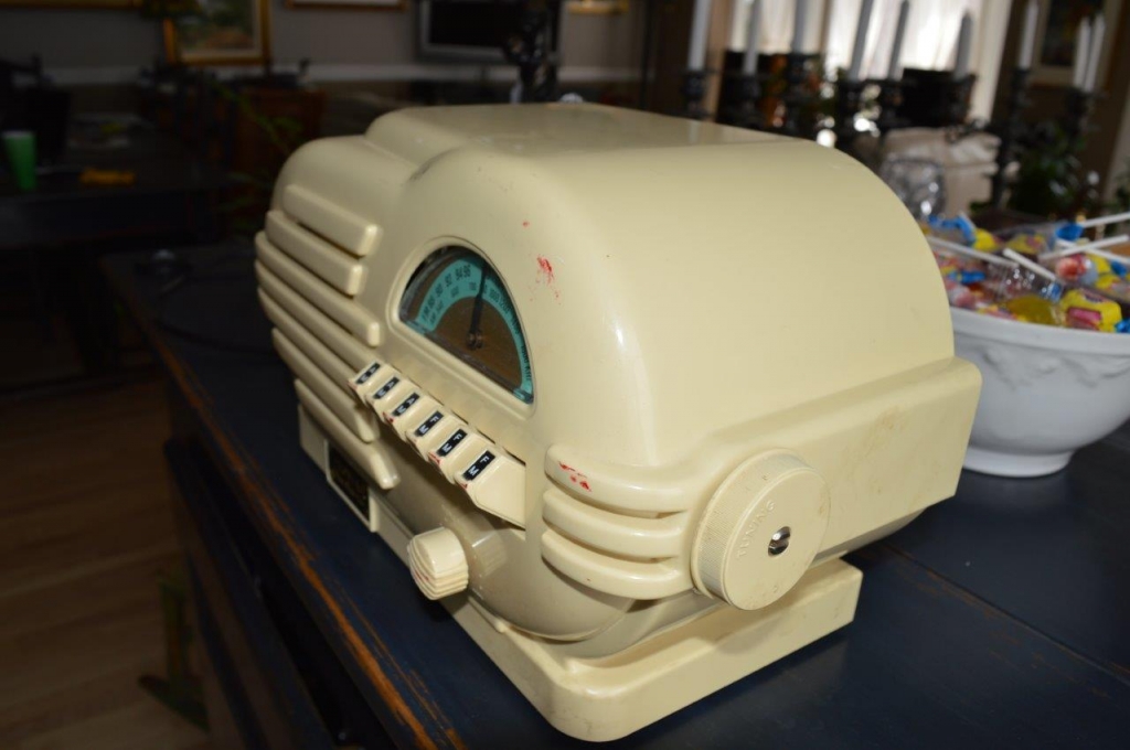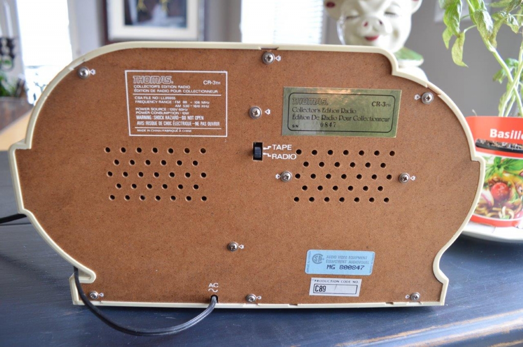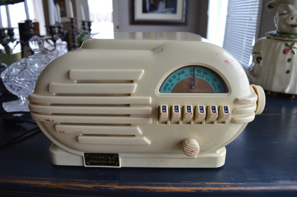 Radio avec bâtis en plastique de marque Thomas. Pièce reproduction d'un ancien appareil, il provient d'une succession. De couleur beige il à quelque éraflures et lorsque branché il allume on entends un hum! mais je n'arrive pas à le faire jouer. 13 pouces de long, il est vraiment très beau même comme simple décoration.