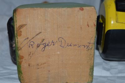 Bonhomme de Roger Dumont, 10 pouces de haut très bonne condition signé sous la base. Roger Dumont, gosseux de St-Arsène tout près de Cacouna il a été surnommé l'homme aux poules .