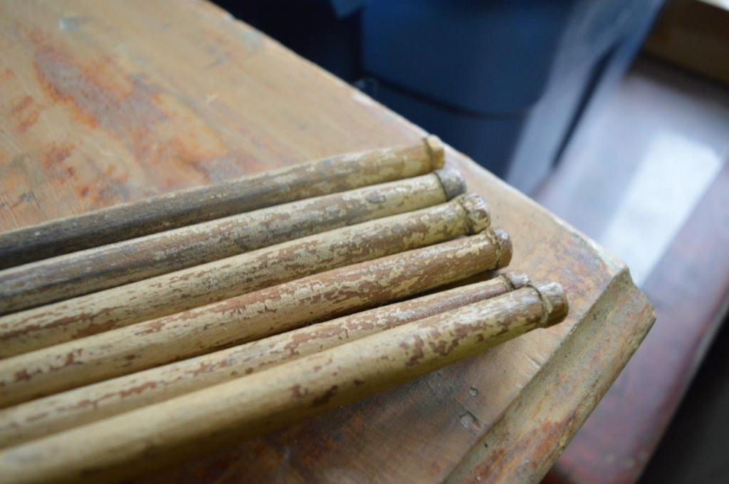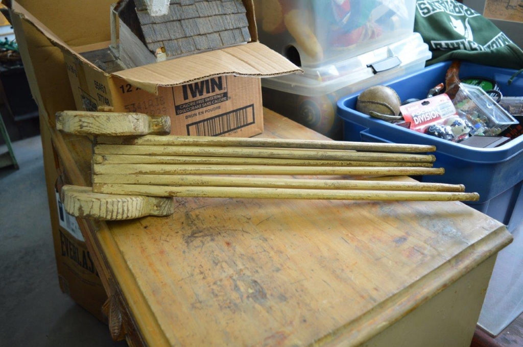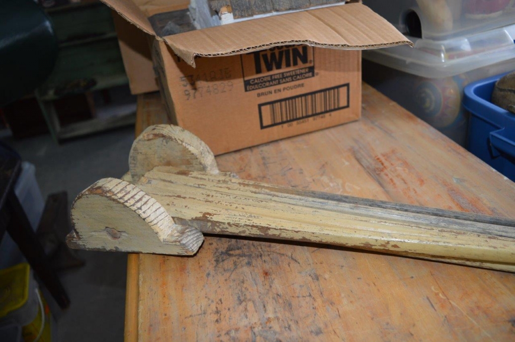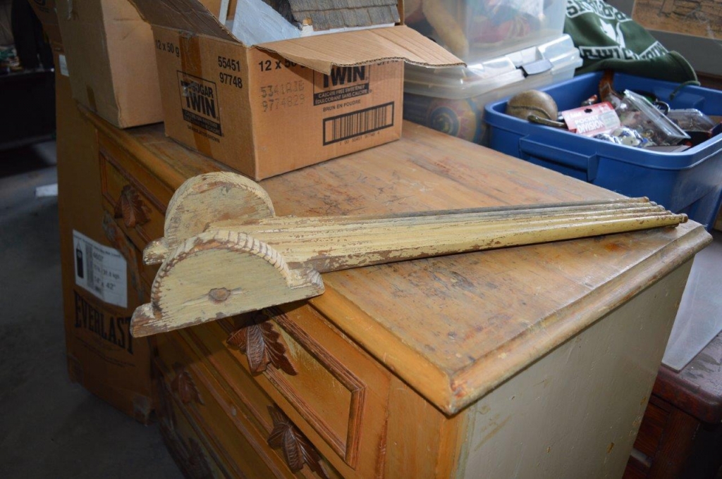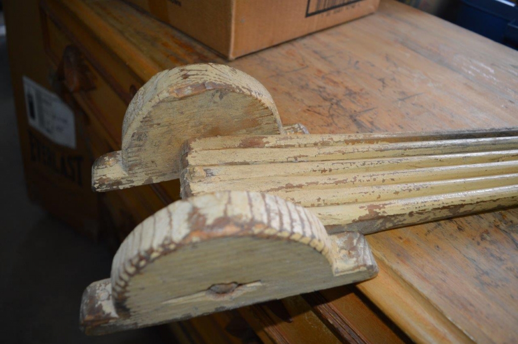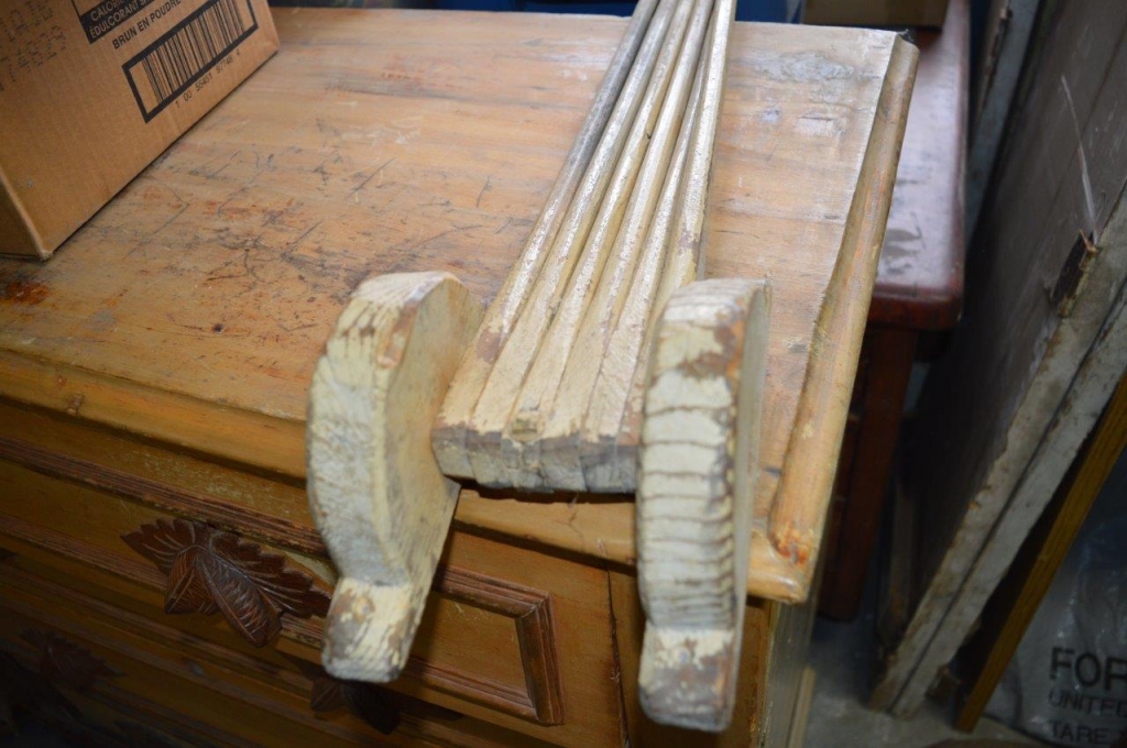 Superbe pièce avec un jaune ocre vraiment fou, ce séchoir à linge est à 6 branches, et mesure 25.5 pouces de long. Less tiges de bois et même le montant qui va au mur sint sculptés. magnifique pièce d'art populaire de la succession de Michel Sauvé.