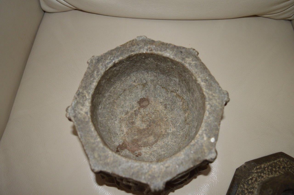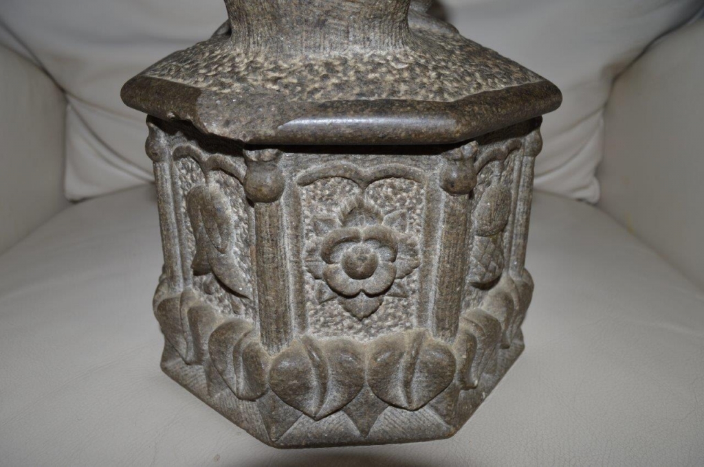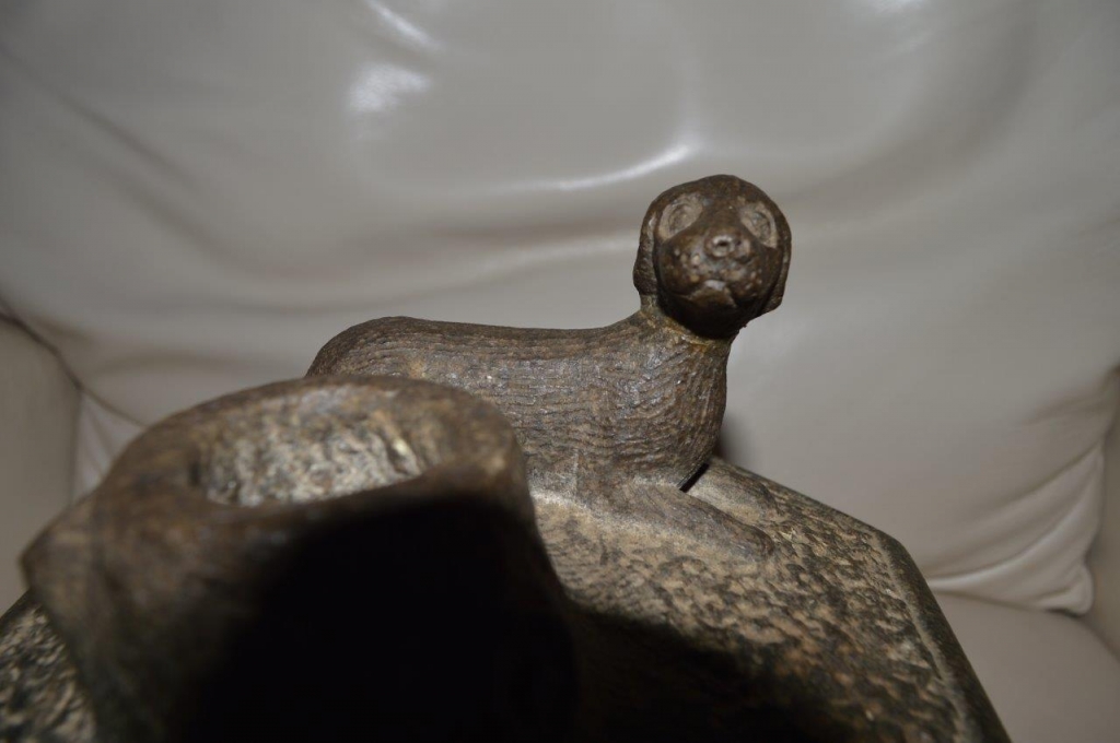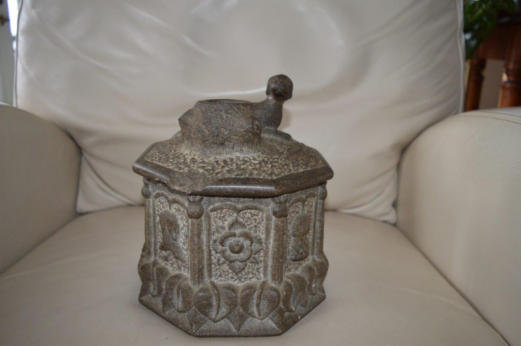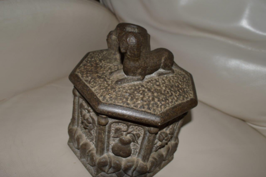 Importante pièce , tabactière Québécoise en pierre, fabriquée par des artisans qui travaillaient de la carrière de St-Roch de l'Achigan. Excessivement rare vous avez ici une pièce de qualité muséale qui est en magnifique condition les seuls dommages un chip ancienne sur le couvercle et la tête du chien recollée ce qui n'influence en aucune façon sa valeur 8.5 pouces de hauteur X 7.75 de diamètre. On peut trouver un exemple de ces pièces dans le livre de Michel Lessard. Pièce en provenance de la succession de feu Michel Sauvé de Grenville QC.
